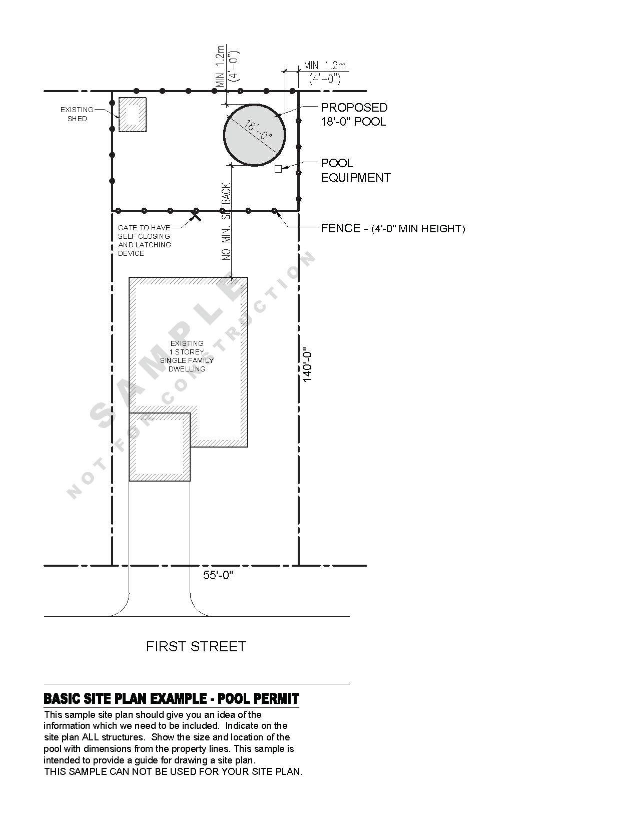 - Prepare a Site Plan showing the location of the swimming pool enclosure, swimming pool and swimming pool equipment on the property in relation to the location of the property lines, street lines, sewage system and all buildings on the property.