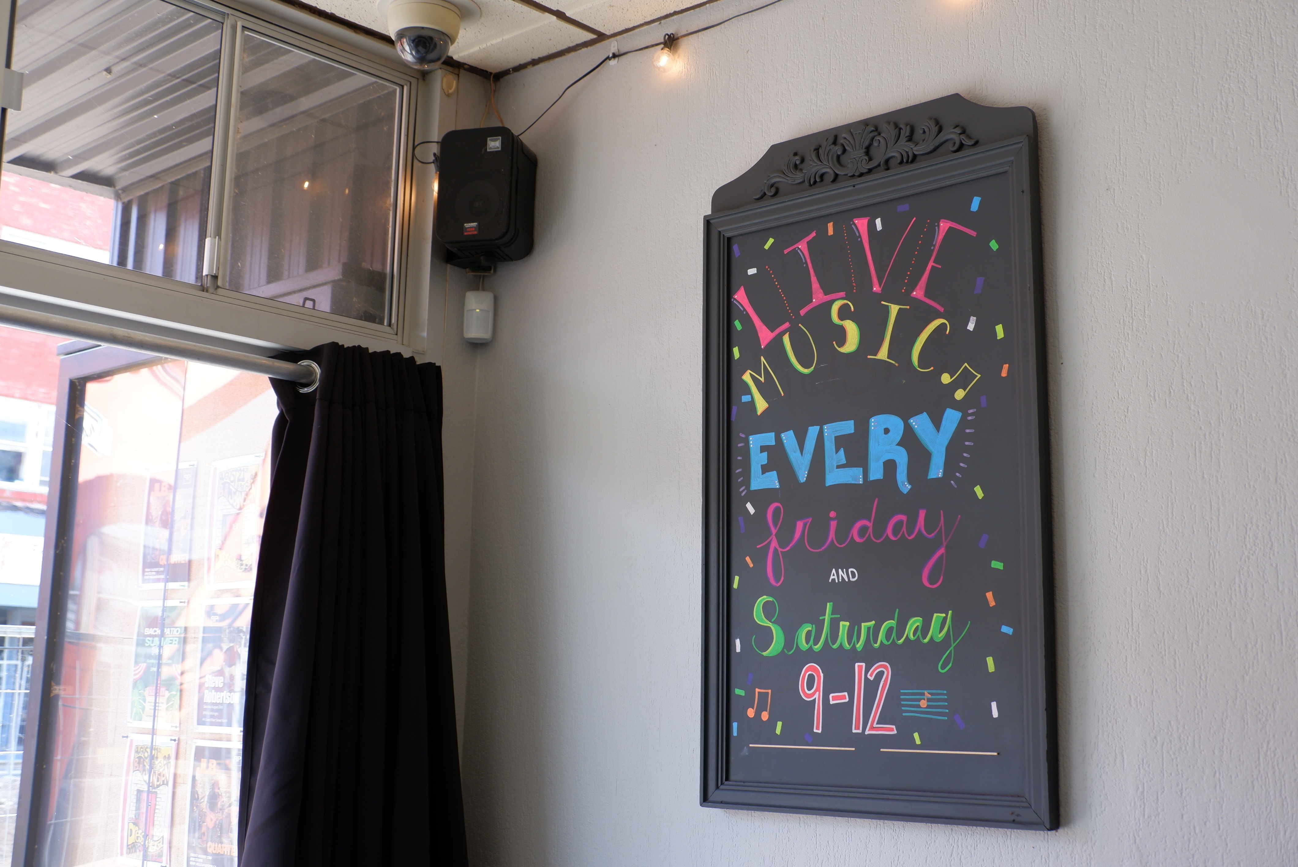 Downtown Dig construction meant they couldn’t set up their usual front patio, so Evans and his team decided to install a new patio out back – a quiet nook with outdoor seating, string lights, all overlooking Sales Decorating Centre’s brand-new mural next door.