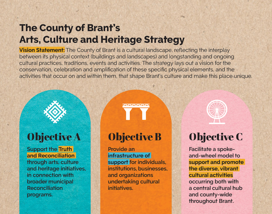 In response to the 2019 Strategic Plan, Council authorized the preparation of an arts, culture and heritage strategy in 2023. Developed between June 2023 and January 2024, the resulting Brant Arts, Culture & Heritage Strategy (“the Strategy”) relies on public feedback, stakeholder input, background research and industry best practice to present an action plan for the County’s support of the arts, culture and heritage sectors over the next ten years.